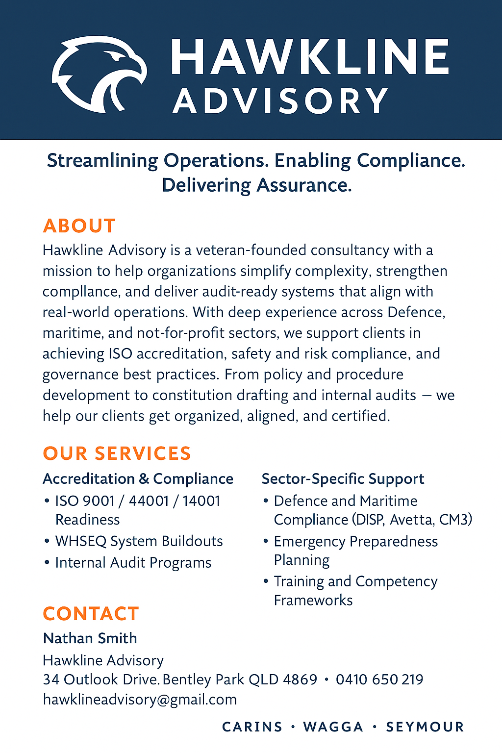 At Hawkline Advisory, we work with SMEs, contractors, and community organisations to develop systems, documentation, and compliance strategies that align with operational realities. Proudly veteran-owned, regionally based, and nationally available.